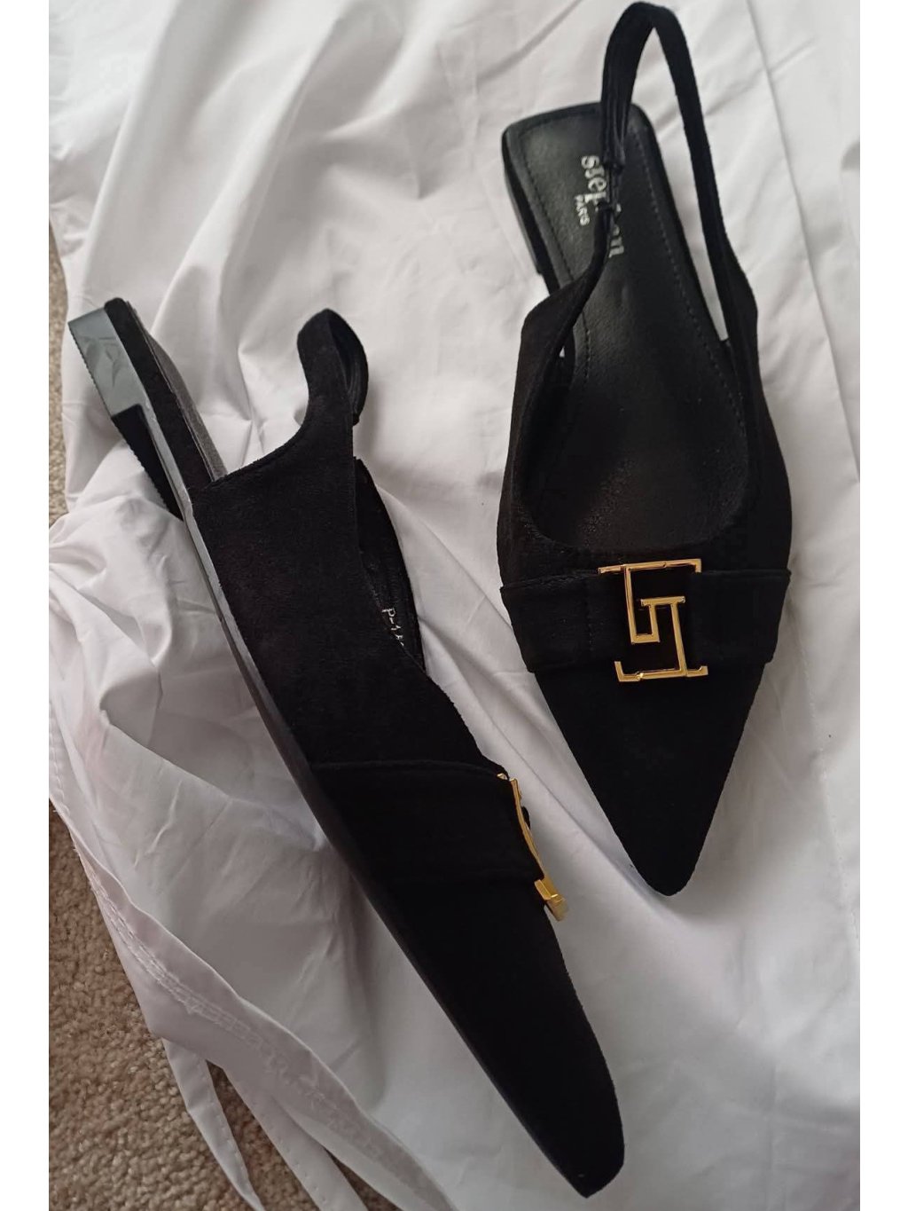 Luxusní balerínky bez paty z eco kůže-vzhled semiš.V černé barvě. Moderní střih s otevřenou patou (slingback) a ostrou špičkou. Přední část zdobí výrazná zlatá geometrická spona, která botám dodává luxusní vzhled