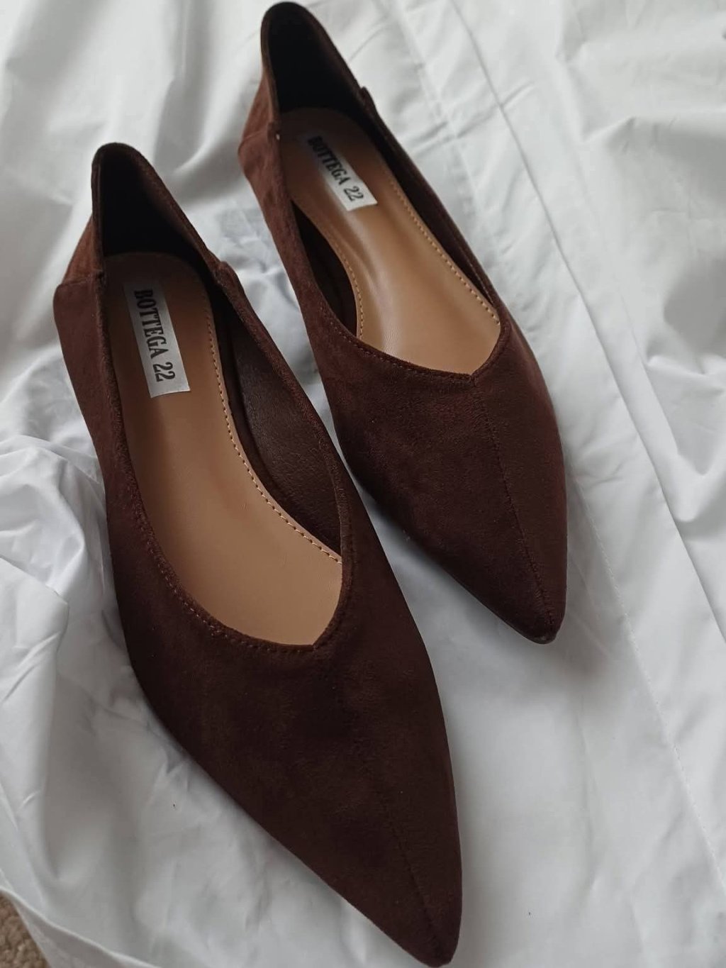 Elegantní semišové baleríny se špičatou špičkou – tm. hnědé